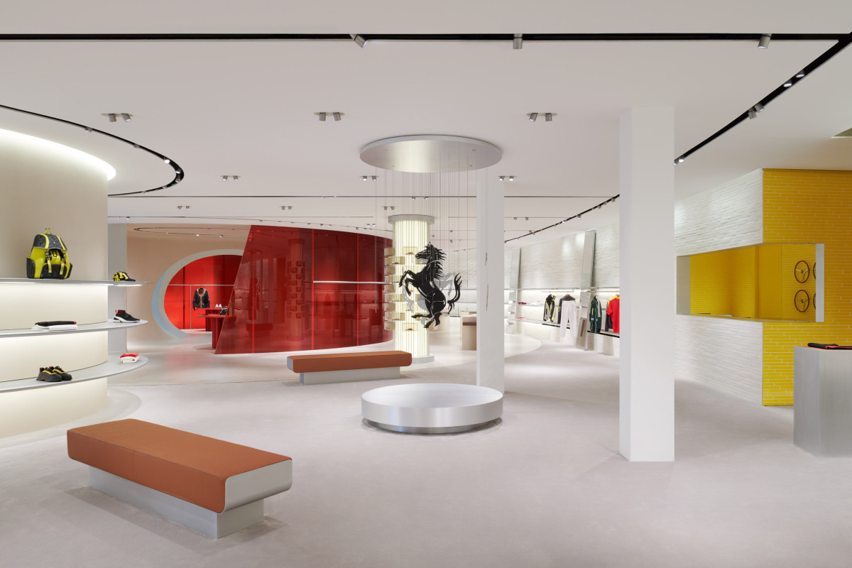 与此次法拉利时装系列发布同步,全新法拉利生活方式精品店6月13日在马拉内罗翻新开业。这家精品店位于当地一栋八十年代的建筑内,由伦敦建筑设计工作室 Sybarite 操刀设计。
