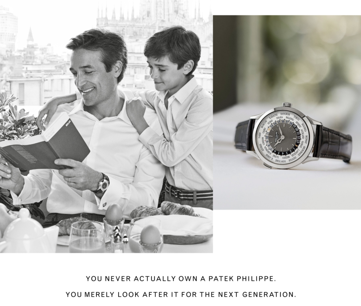 不过,百达翡丽并未因其享有的尊贵地位而拉开与用户的距离,这在很大程度上要归功于品牌1996年推出的经典广告“没有人真正拥有百达翡丽,你只不过在为下一代保管而已 (You never actually own a Patek Philippe , you merely look after it for the next generation.)”。这一广告词前半句看似高冷,但后半句转而从家族传承这一传统价值观切入,让品牌与更广大的受众建立起了情感连接。这一广告词也沿用至今,比如品牌2019年秋发起的创意宣传活动中就聚焦父爱,通过父子间亲密互动凸显品牌的传承理念。