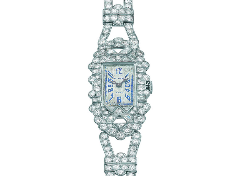 瑞士高级制表基金会(Fondation de la Haute Horlogerie,简称“FHH”)的档案资料显示,尽管宝格丽可能自1884年创立伊始就开始销售钟表,但已知其首个自创表款可追溯至1920年代。这是一款由钻石和铂金打造的女士腕表,矩形表盘上镶嵌了圆形和三角形的钻石,表链采用镂空设计,亦镶嵌有圆形切割钻石(见下图)。