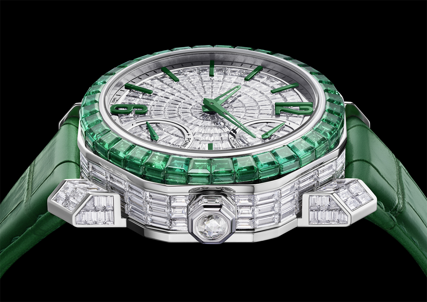 上图:Octo Roma 大自鸣祖母绿腕表配备四组音锤和音簧,是宝格丽迄今为止打造的高度精密复杂的时计