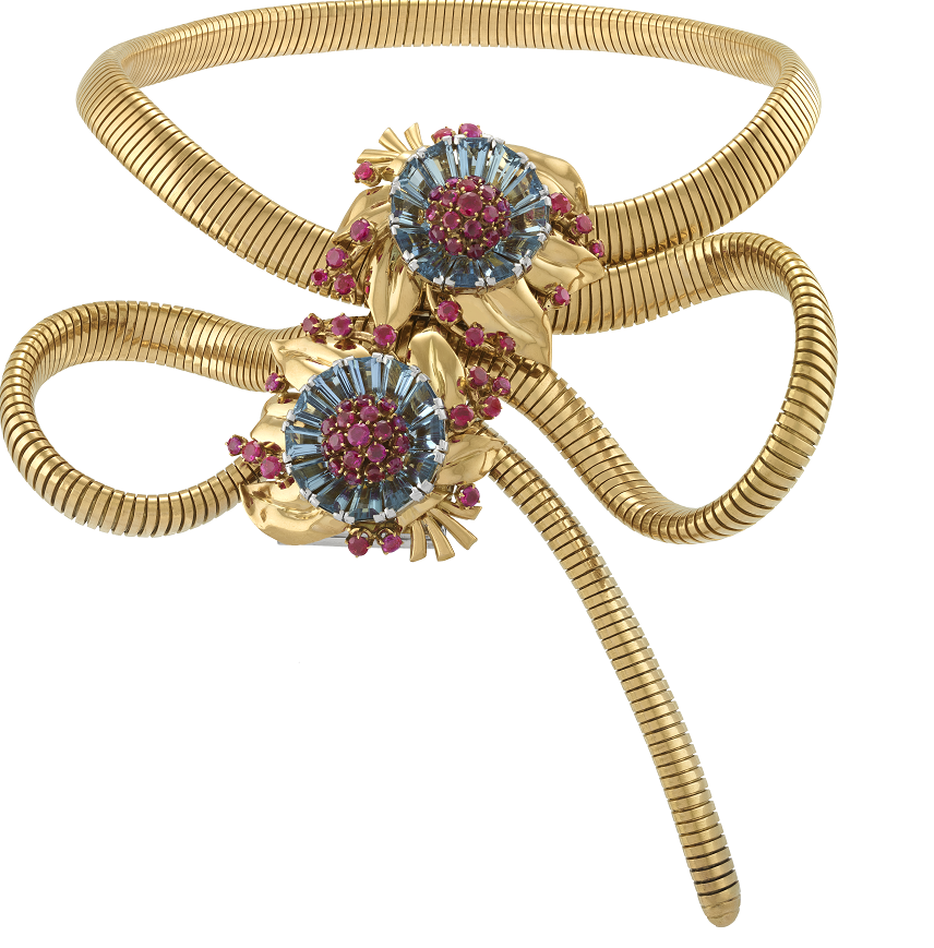 梵克雅宝1938年获得专利的可转换式珠宝作品之一万能珠宝项链,这件作品的两枚花朵别针下隐藏着一个活动机关,可轻松转变为项链、短项链、长项链、手链或腰带。花形胸针还可以拆卸下来单独作为胸针佩戴,甚至部分设计还可以用做夹式耳环。