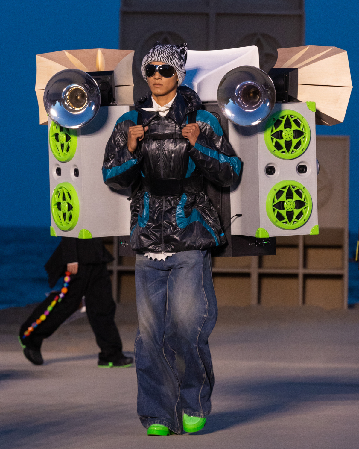 本次时装秀给嘉宾们的伴手礼中有两个玩具:一套是挖沙的小桶和铲子,一套是可以拼插的纸板沙子城堡,无声地传递着“童真”这个关键词。今年6月,同样的这场男装秀,路易威登在巴黎将秀场打造成一个放大数倍的玩具赛道,并由一所大学的游行乐队为大秀开场,引领象征童年梦想的游行队伍大步向前。今次阿那亚大秀则无疑是对6月巴黎“放大的游乐场”理念的提炼和再一次诠释。