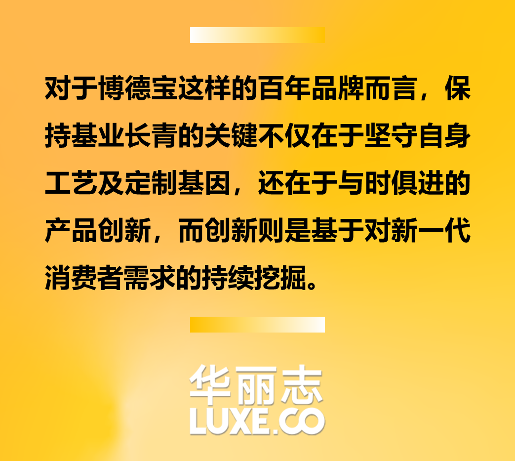 对于博德宝这样的百年品牌而言,保持基业长青的关键不仅在于坚守自身工艺及定制基因,还在于与时俱进的产品创新,而创新则是基于对新一代消费者需求的持续挖掘。