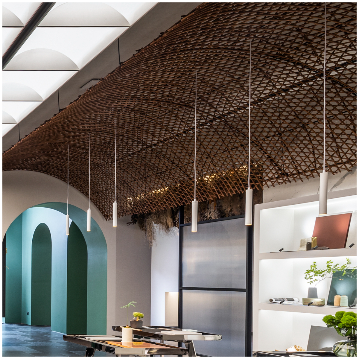 全新的上海体验中心便是集团为此迈出的第一步,在体验中心入口处悬挂着由浙江的藤编手工艺人编制的一块藤编天花板吊顶(下图),“在品牌德国总部的展厅中,也有一处类似的装置,但用的是当地特有的植物制作,未来的新店设计中,我们也会更多地结合当地文化和当地生活元素”,林晓伟介绍道。