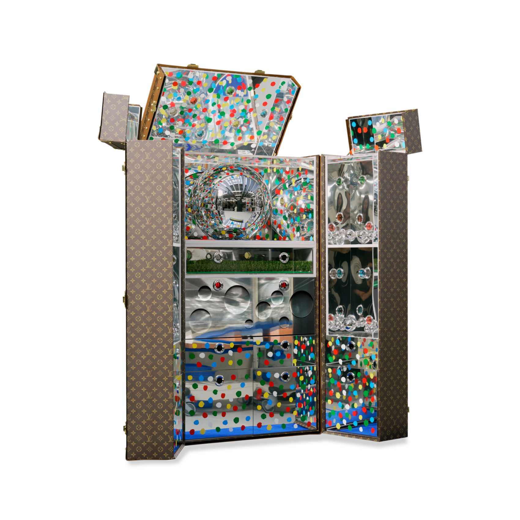 比如与日本艺术家草间弥生合作的 LVxYK Exceptional 硬箱,这个升级版的酒柜吧台硬箱(Party Trunk)可以容纳一整套香槟用具,包括酒瓶、玻璃杯、冰桶等,有机玻璃板和盒盖镜子上装饰着草间弥生标志性的彩色波点,一个巨大的迪斯科球反射出派对的跃动氛围。
