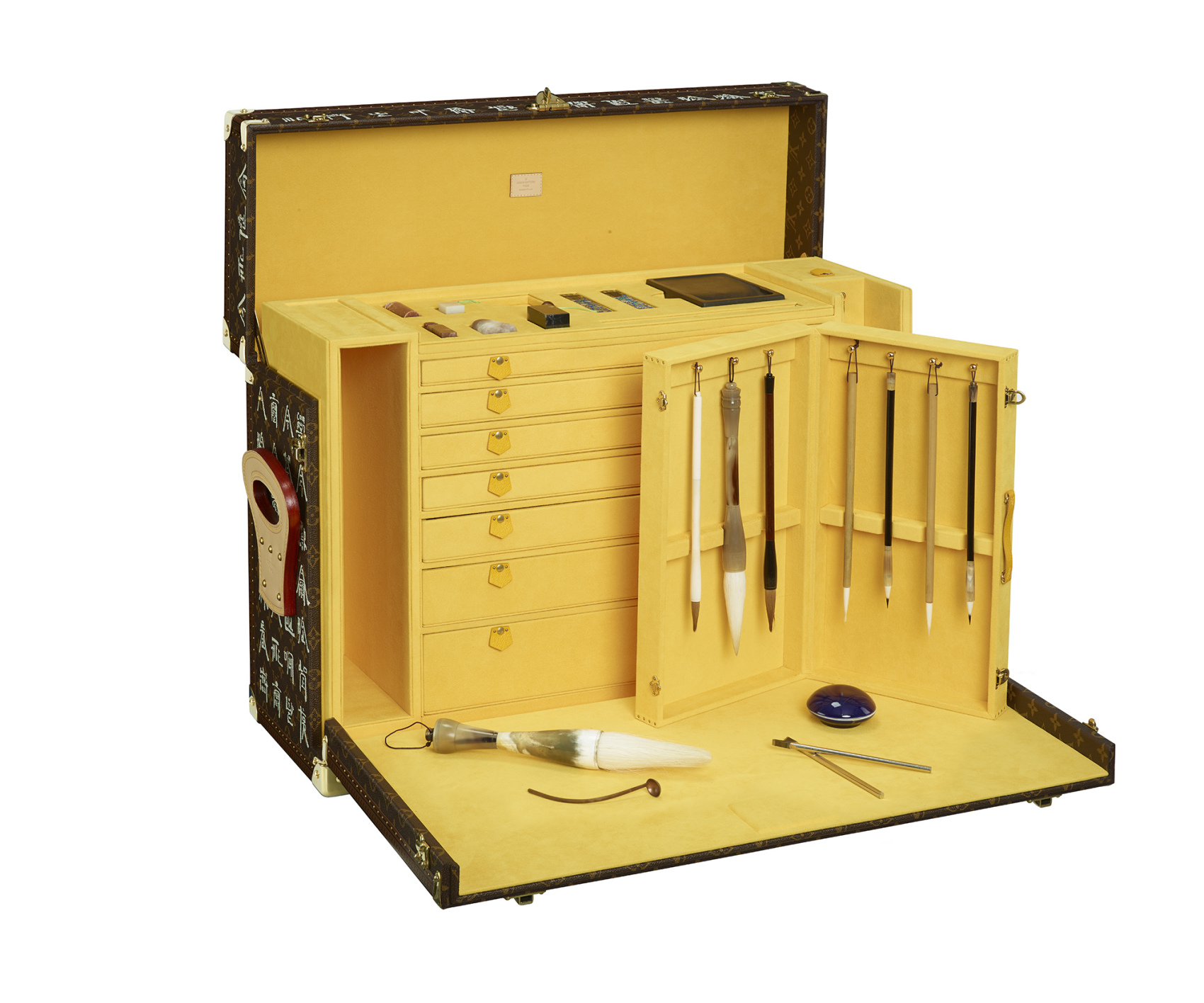 2016年 Louis Vuitton 与中国艺术家徐冰携手,以其代表作品“英文方块字书法”为灵感,创作出独一无二的文房四宝特别定制硬箱。箱内除了文房四宝以外,还包括刻刀、刻台、印泥、笔架、毛毡等中国传统文化中的文书工具。