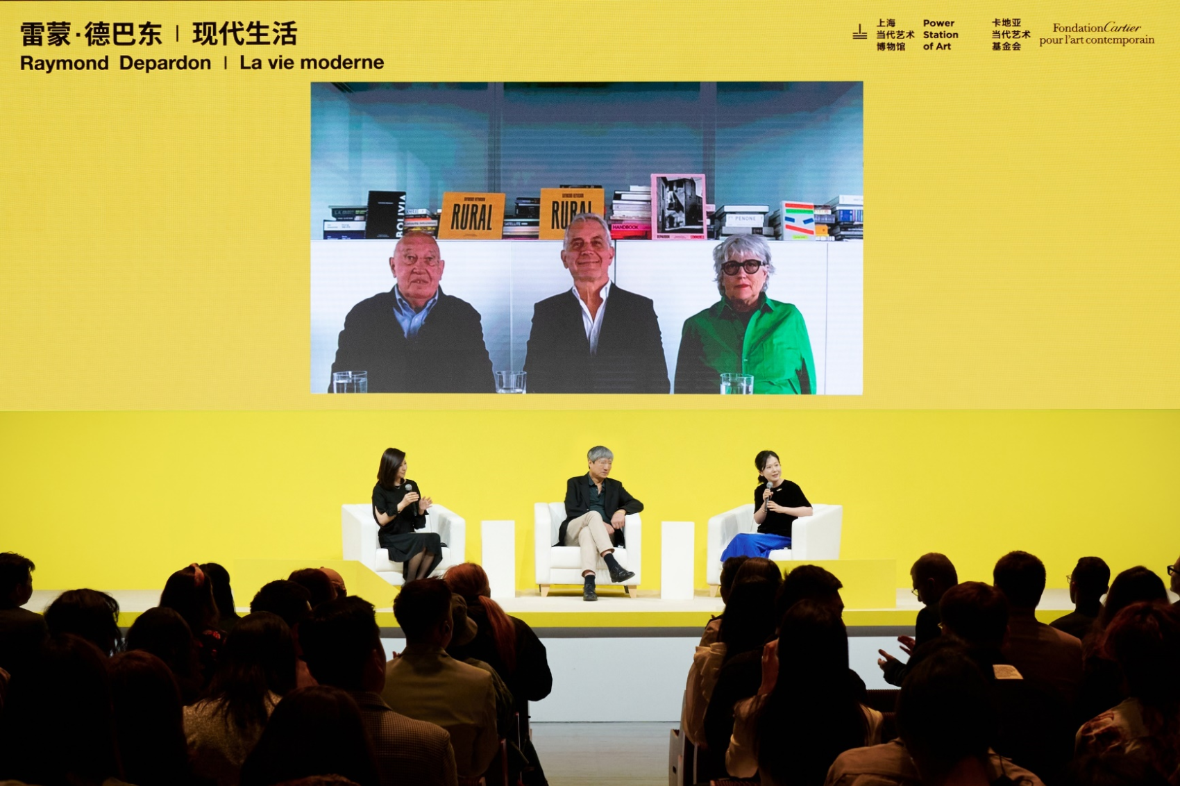 开幕当天,上海当代艺术博物馆馆长及此次展览策展人龚彦女士、艺术评论家及此次展览策展人,费大为先生在展览现场,与雷蒙·德巴东先生、卡地亚当代艺术基金会艺术馆长及此次展览策展人埃尔维·尚戴斯(Hervé Chandès)先生、克劳迪娜·努加雷(Claudine Nougaret)女士远程连线