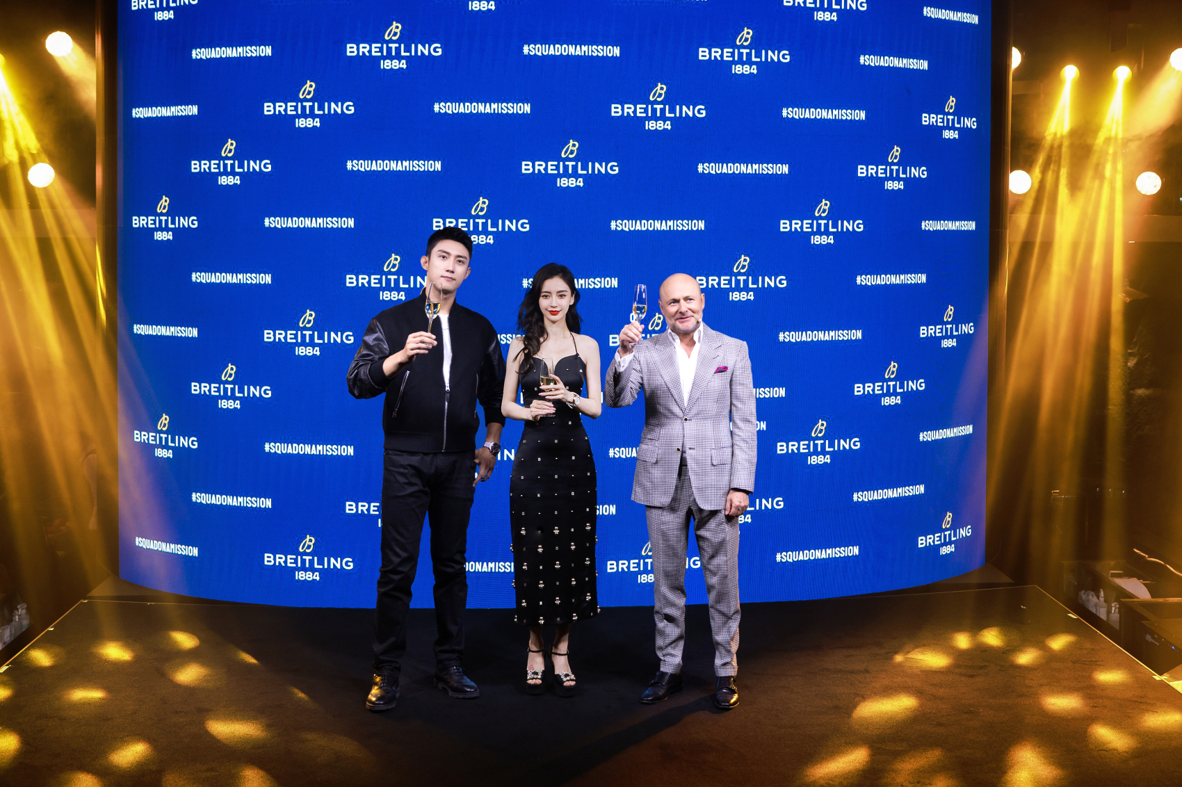 6月15日,百年灵于上海装饰艺术风格的建筑典范百乐门举行媒体发布会,官宣中国女演员 Angelababy 杨颖和男演员黄景瑜成为品牌代言人。上图从左到右依次为:黄景瑜、Angelababy 杨颖和 Georges A. Kern。