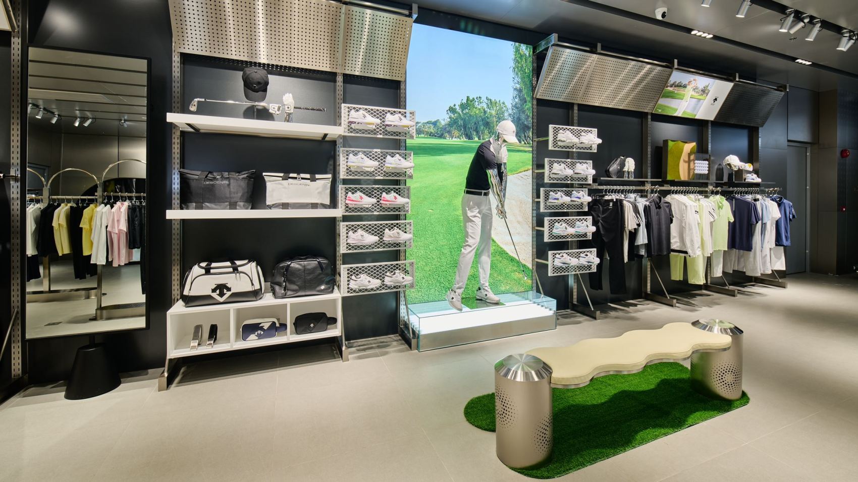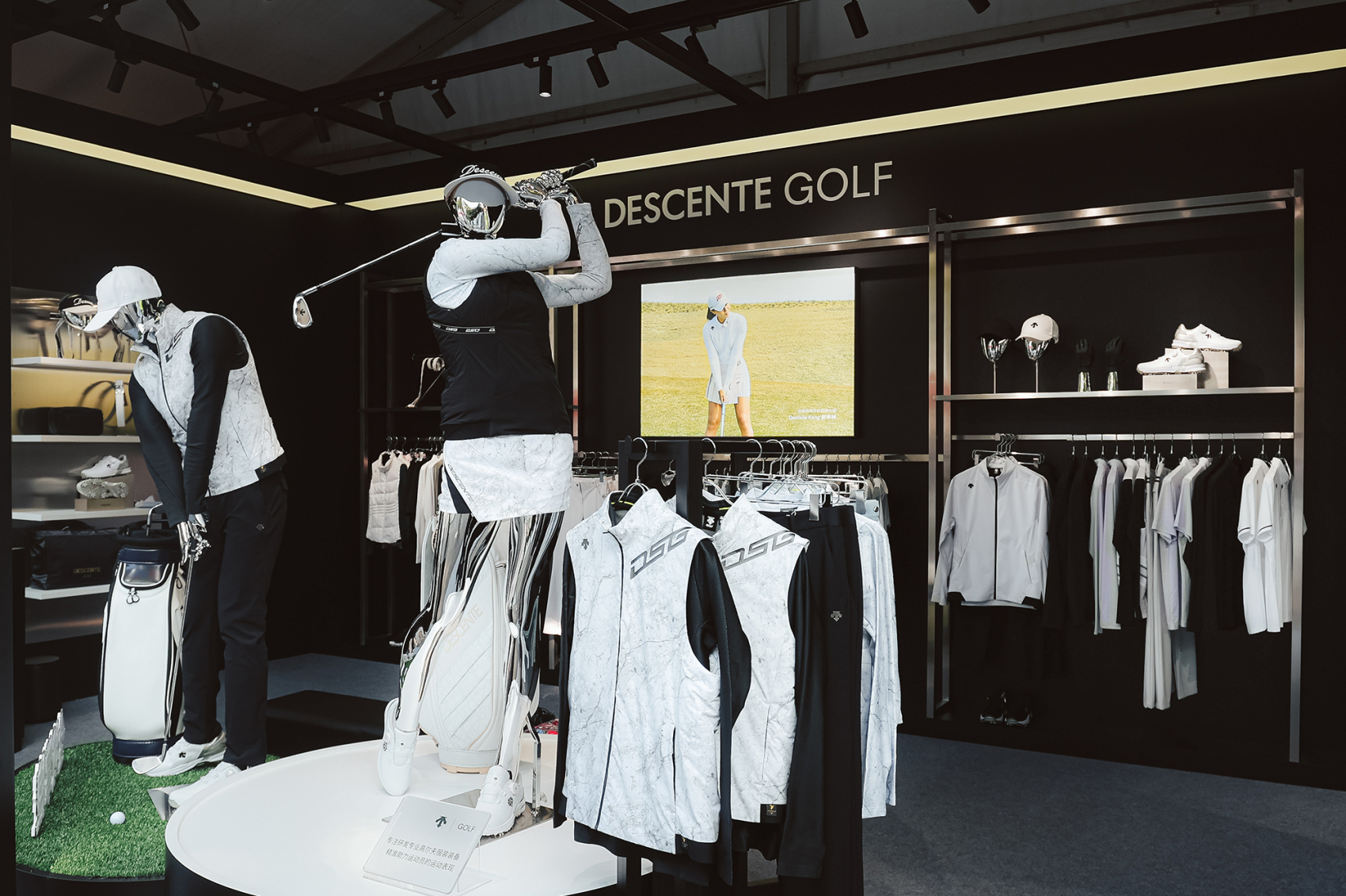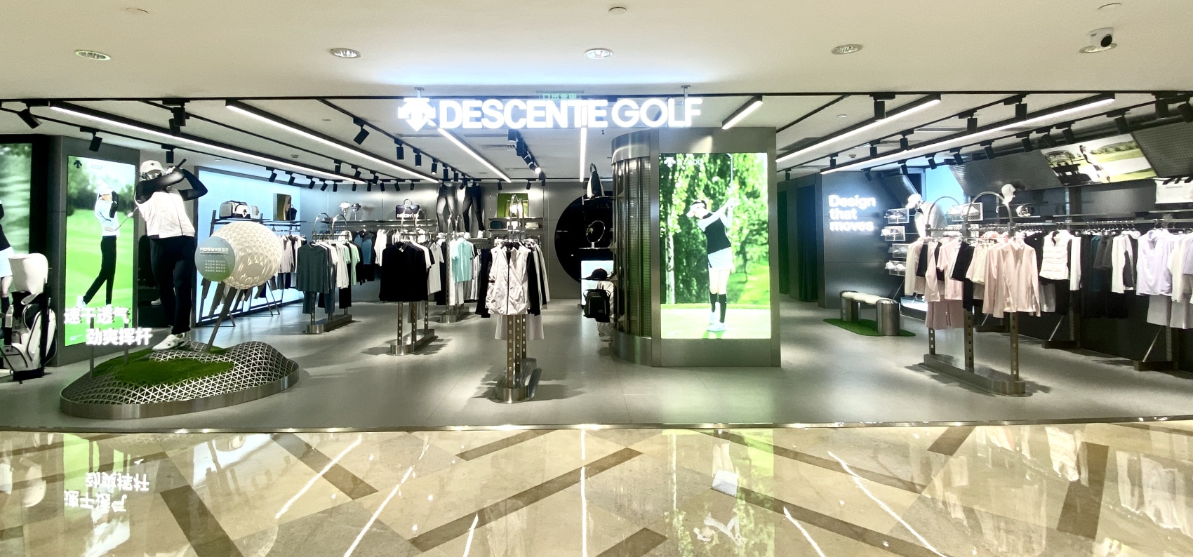 去年9月,迪桑特在华南地区面积最大店铺广州IGC店投入使用,并设立了专门的迪桑特高尔夫区域。有别于传统门店单纯陈列产品、展板式展示科技,该门店灵活运用一系列兼具视觉设计和功能性的元素,深度还原高尔夫球场的碧绿草坪。通过“店中店”的运营模式,将专业高尔夫的形象与迪桑特产品全矩阵有机结合,打造出升级后的新零售组合业态。