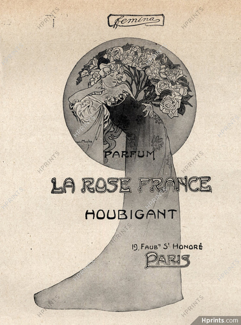 在鼎盛时期,Houbigant 曾收获了路易十四、玛丽王后、拿破仑、伊丽莎白女王、沙皇亚历山大三世、托尔斯泰、莫泊桑等皇室名流客户。捷克插画大师慕夏也曾亲自为其设计香水瓶和包装盒和平面广告图(下图)。