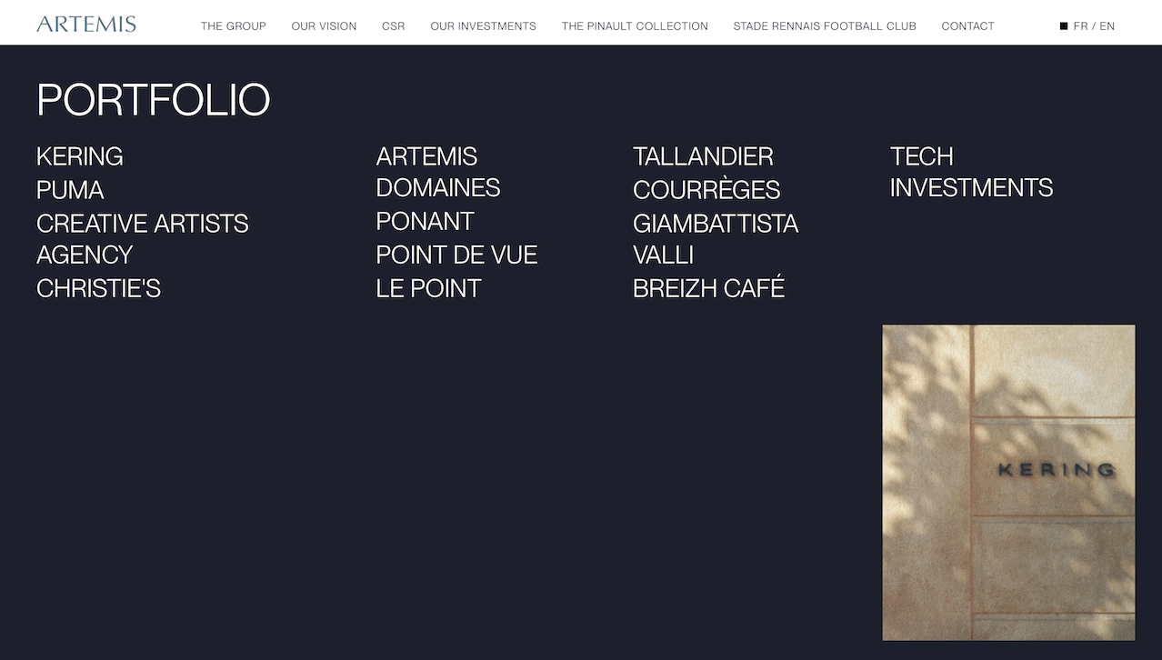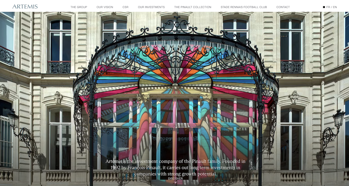 Artemis 成立于1992年,管理着一个涵盖奢侈品、艺术品、体育、媒体和房地产的广泛投资组合,包括:开云集团、佳士得拍卖行、多处葡萄园、法国邮轮公司、艺人经纪公司 Creative Artists Agency(CAA)等。近期的其他投资还包括香水品牌 Creed、一系列优质房地产资产以及意大利奢侈品牌 Valentino(华伦天奴) 30%的股份。