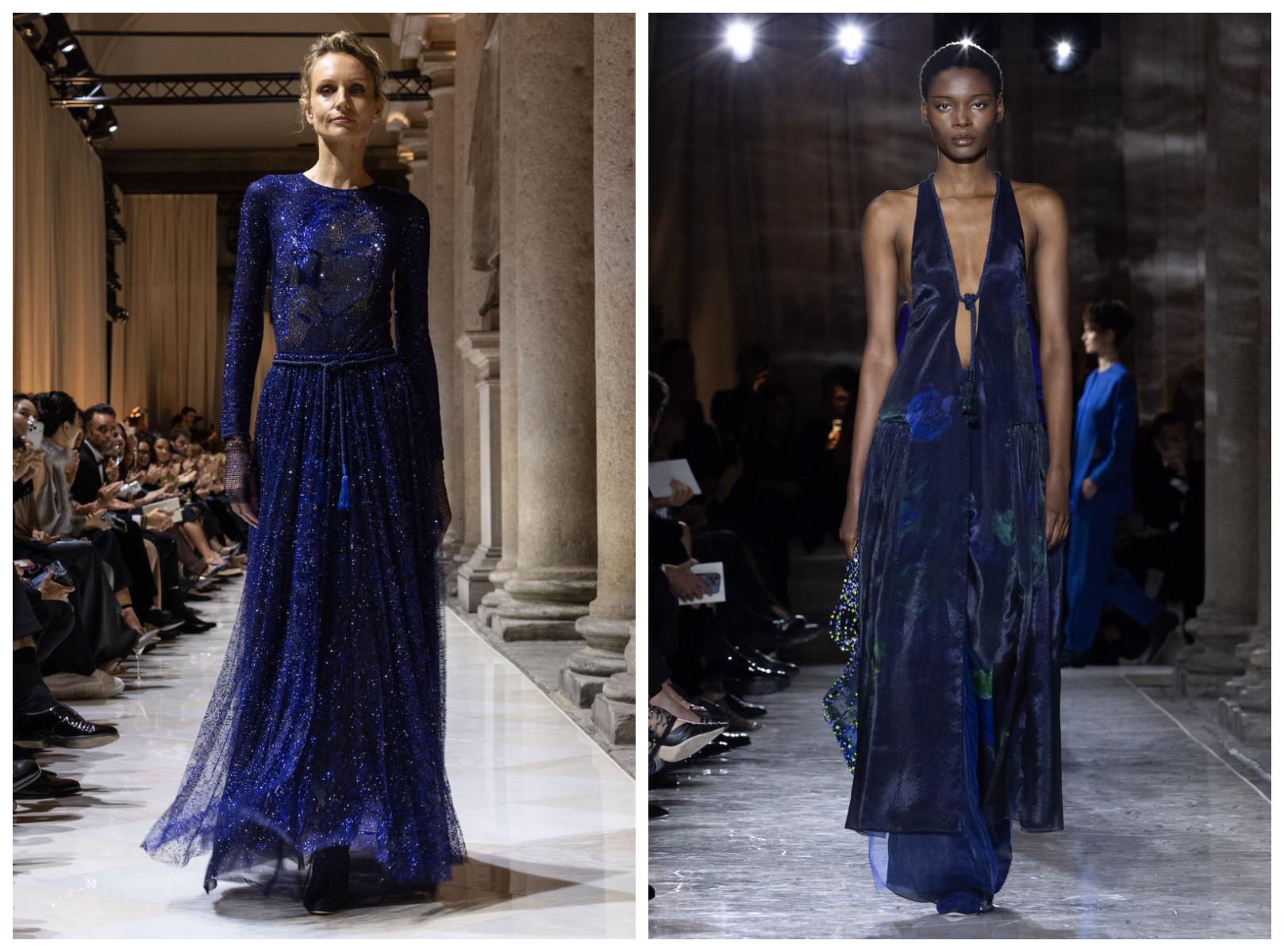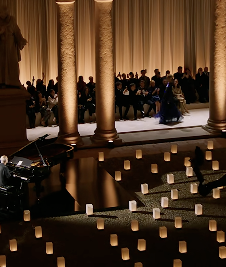 压轴环节,由模特 Agnese Zogla 身着一袭蓝色晚礼服亮相后(下图左),观众在意大利钢琴家和作曲家鲁多维科·艾奥迪(Ludovico Einaudi)现场演奏的悠扬旋律中纷纷起身致敬。