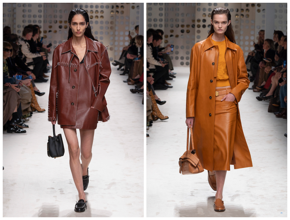材质方面,皮革依然是核心。纳帕(Nappa)软革夹克以简约廓形为基础,通过穿孔细节增添趣味与层次感,彩色皮革绳线穿梭其中,搭配同色系皮质短裙,营造出和谐自然的都市造型。