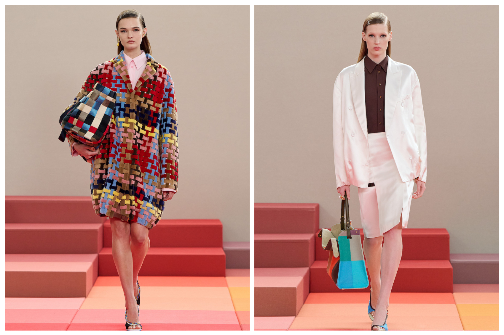 Fendi 2026春夏男女时装秀洋溢着喜悦与活力,秀场由 Marc Newson 设计为不同色块组成的像素化舞台,与 Fendi 服装中的高饱和度色彩相呼应。