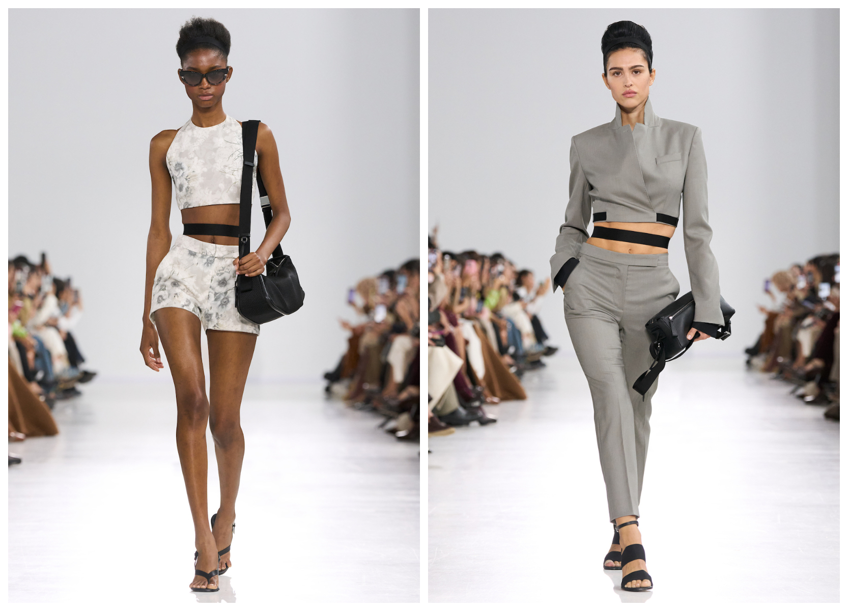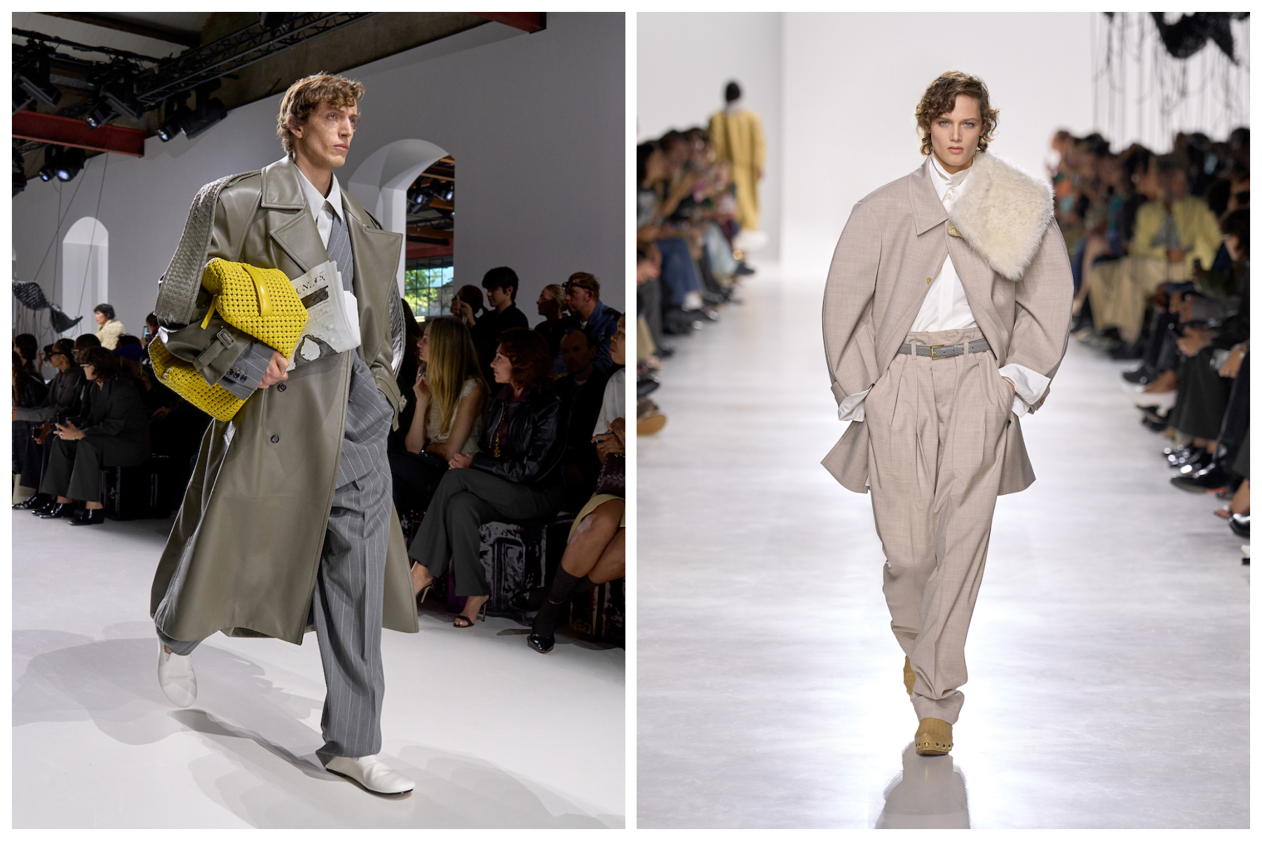 在纯白秀场空间中,模特 Guinevere Van Seenus 为本场大秀开场(下图左)。