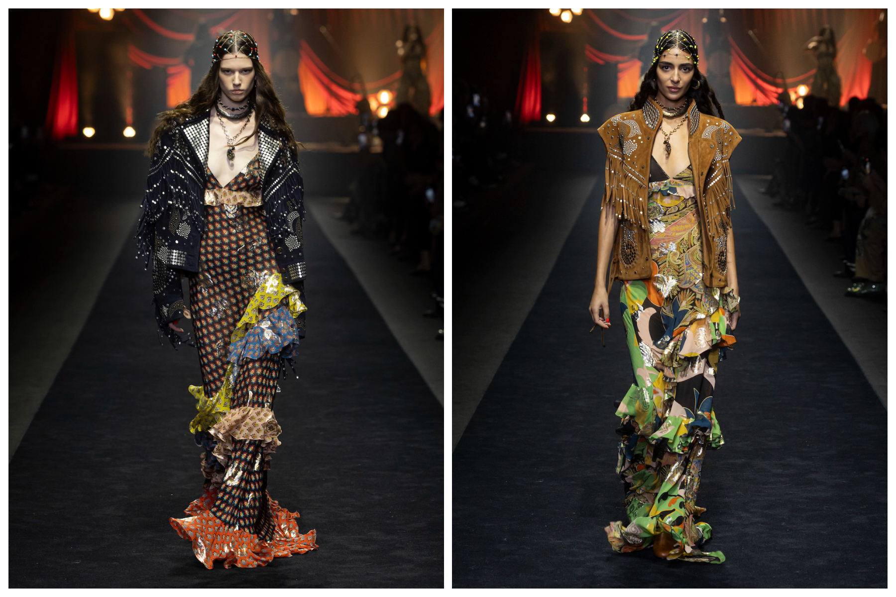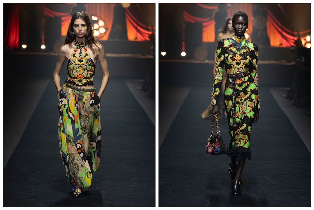 繁复图案与高饱和度色彩在本季得以延续,并通过加入轻盈的荷叶边和流苏等细节,进一步增强服装的流动感。