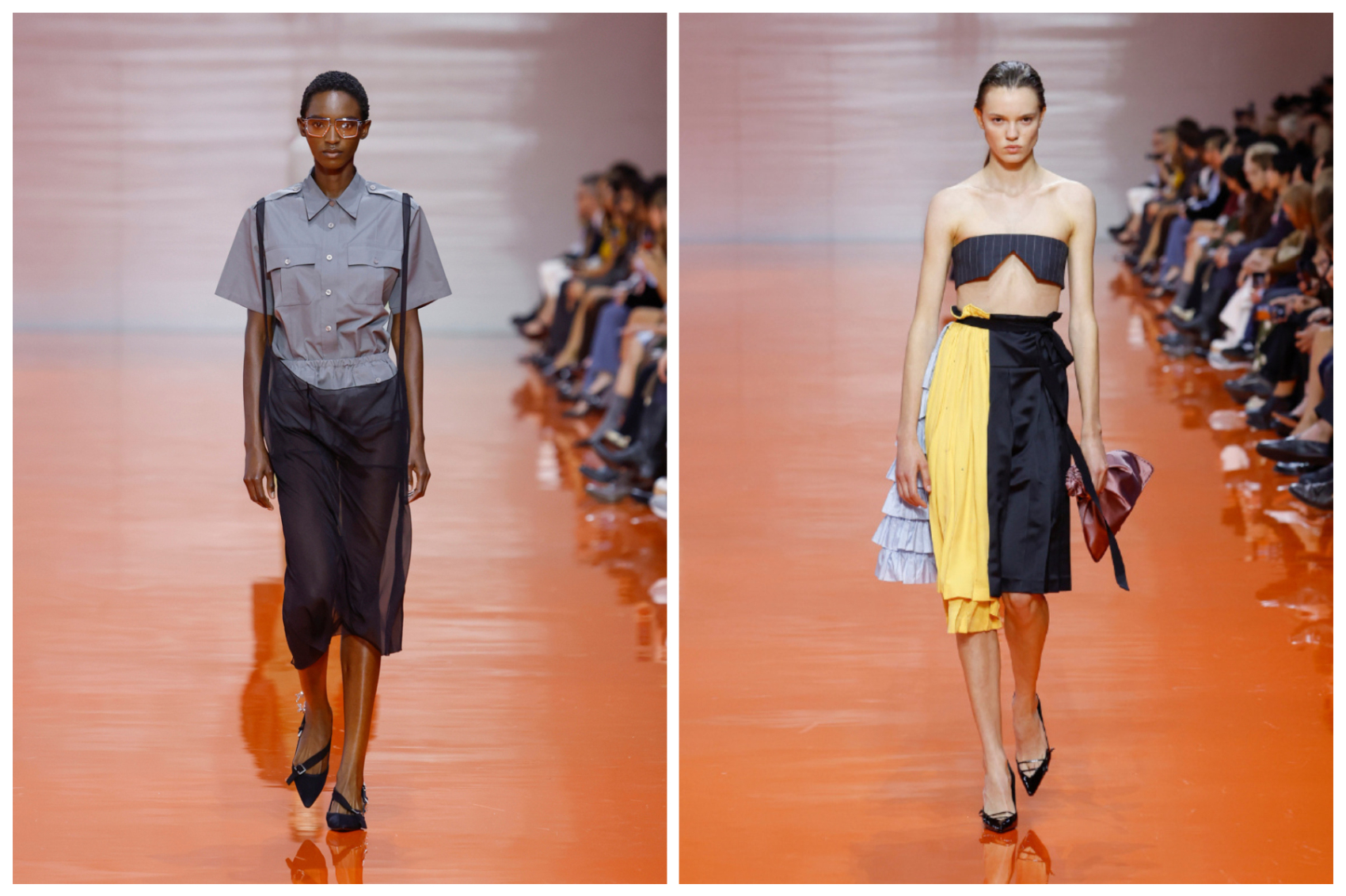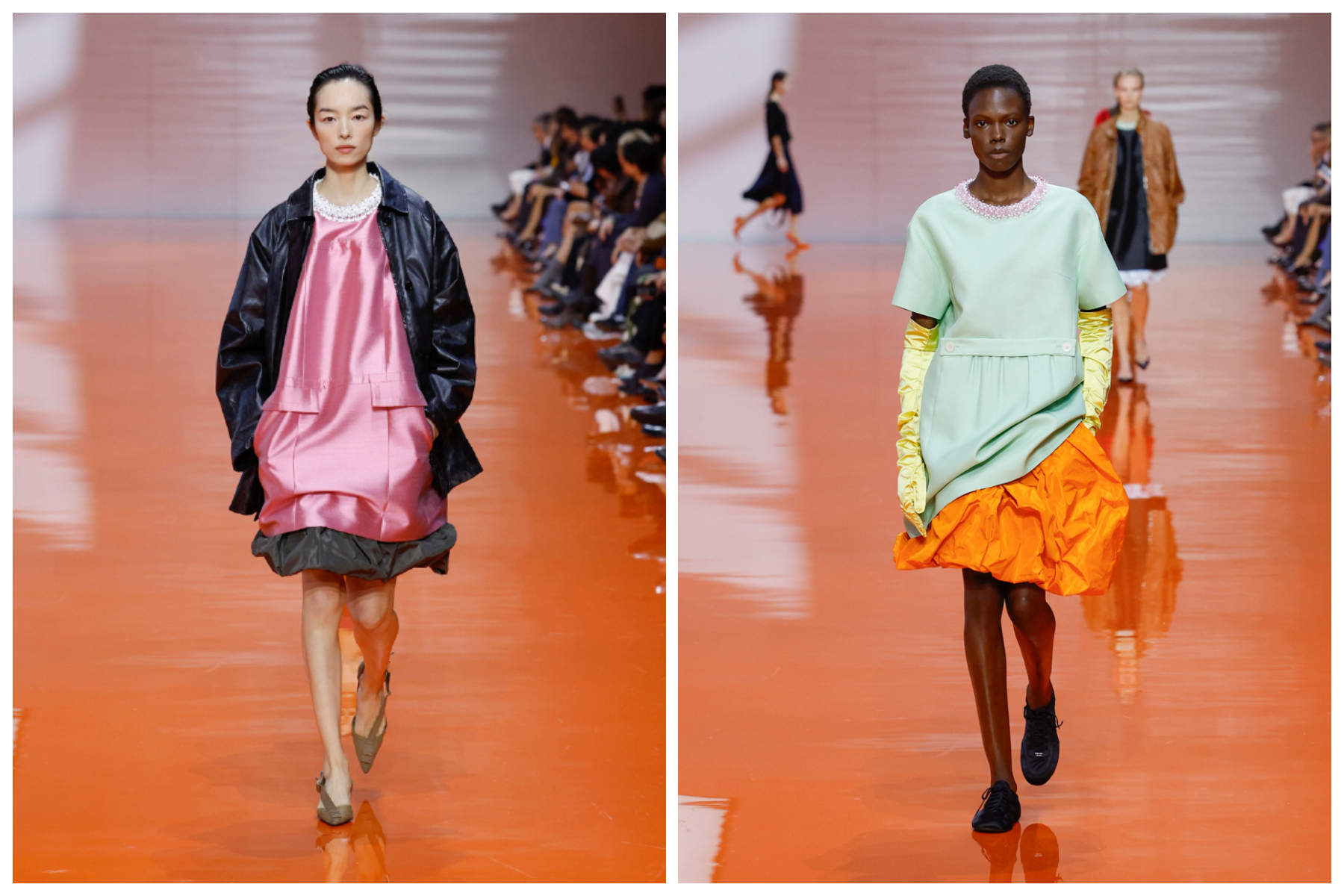 秀场空间整体铺满明亮的橙色,阳光透光一排窗户洒在鲜艳的橙色地板上,为 Prada本场大秀希望传达的“打破固有框架,焕新对着装的解读。”奠定了视觉基调。