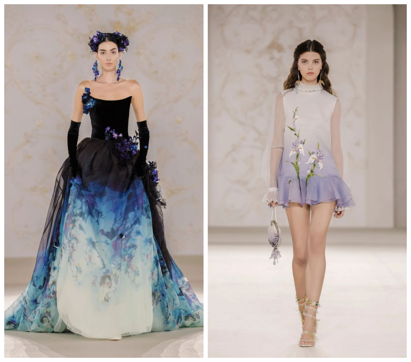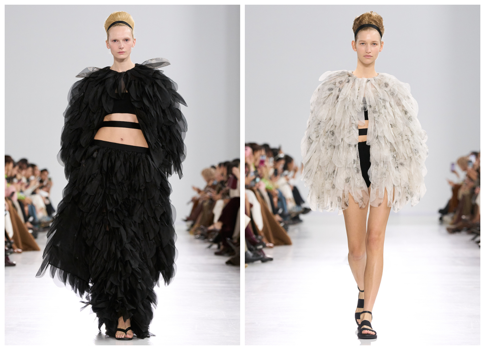 层层叠叠的欧根纱裙由数百片手工剪裁与折叠的布片构成,似奇花盛放;现代感黑色弹⼒腰带、束带式肩带,与柔美洛可可风对比鲜明。