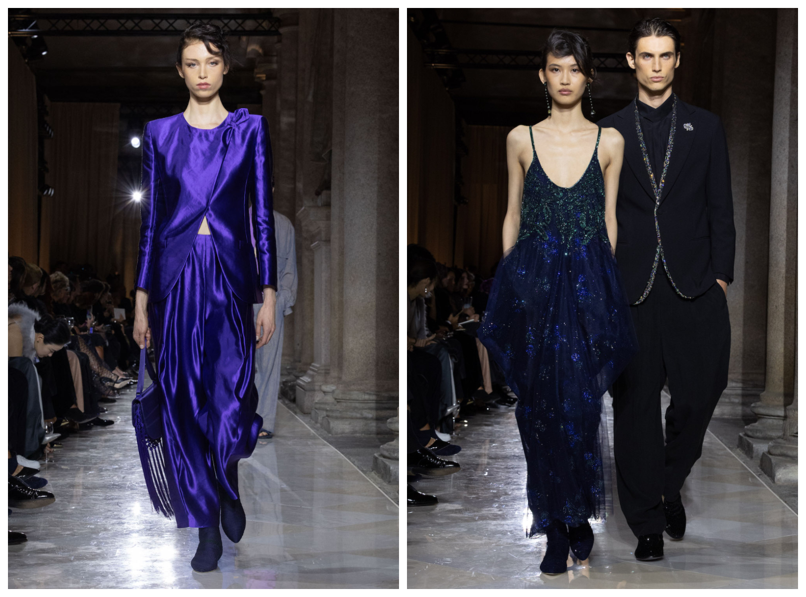 在时装秀现场,Marco De Vincenzo 特邀来自意大利那不勒斯的歌手 La Niña del Sud 现场表演,为这场秀带来听觉上的爆发力。