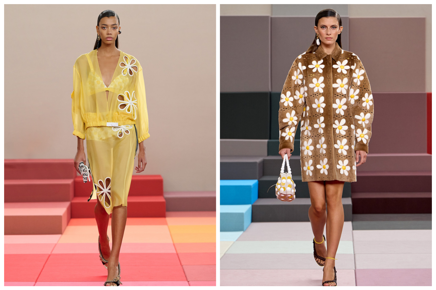 花卉图案在本季成衣中多次出现,或点缀在薄纱上,或铺陈于大衣全身,展现出 Fendi 精湛的意大利工艺。