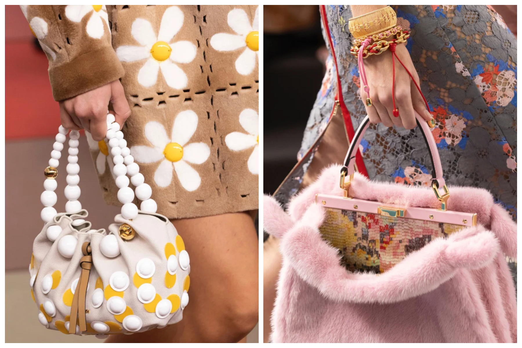 本季不仅推出了多款新包型,也对经典手袋进行了细节重塑:品牌标志性手袋 Peekaboo内外点缀透明花卉串珠网罩,或在内衬饰以彩色亮片;新款 Fendi Collier手袋如串珠般将抽绳小包褶皱收拢于饰有FF标志的球形手柄;新款梯形 Fendi Way手袋选用亮色麂皮与小牛皮,以解构设计打造宽松空间。