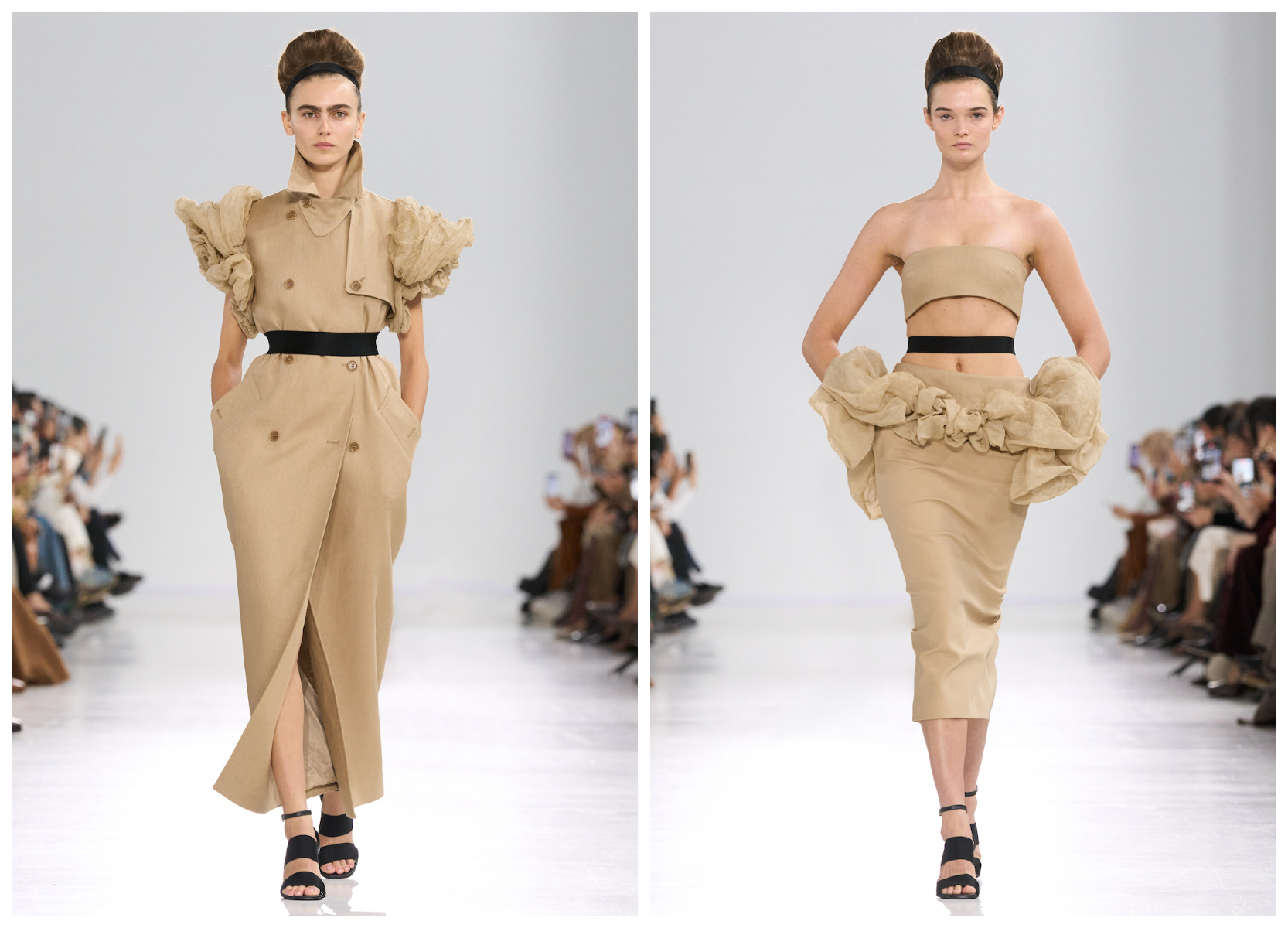 本季成衣亮点细节包括:繁复的褶叠点缀于剪裁利落的风衣肩部或铅笔裙臀部处,像绽开的繁复花冠。