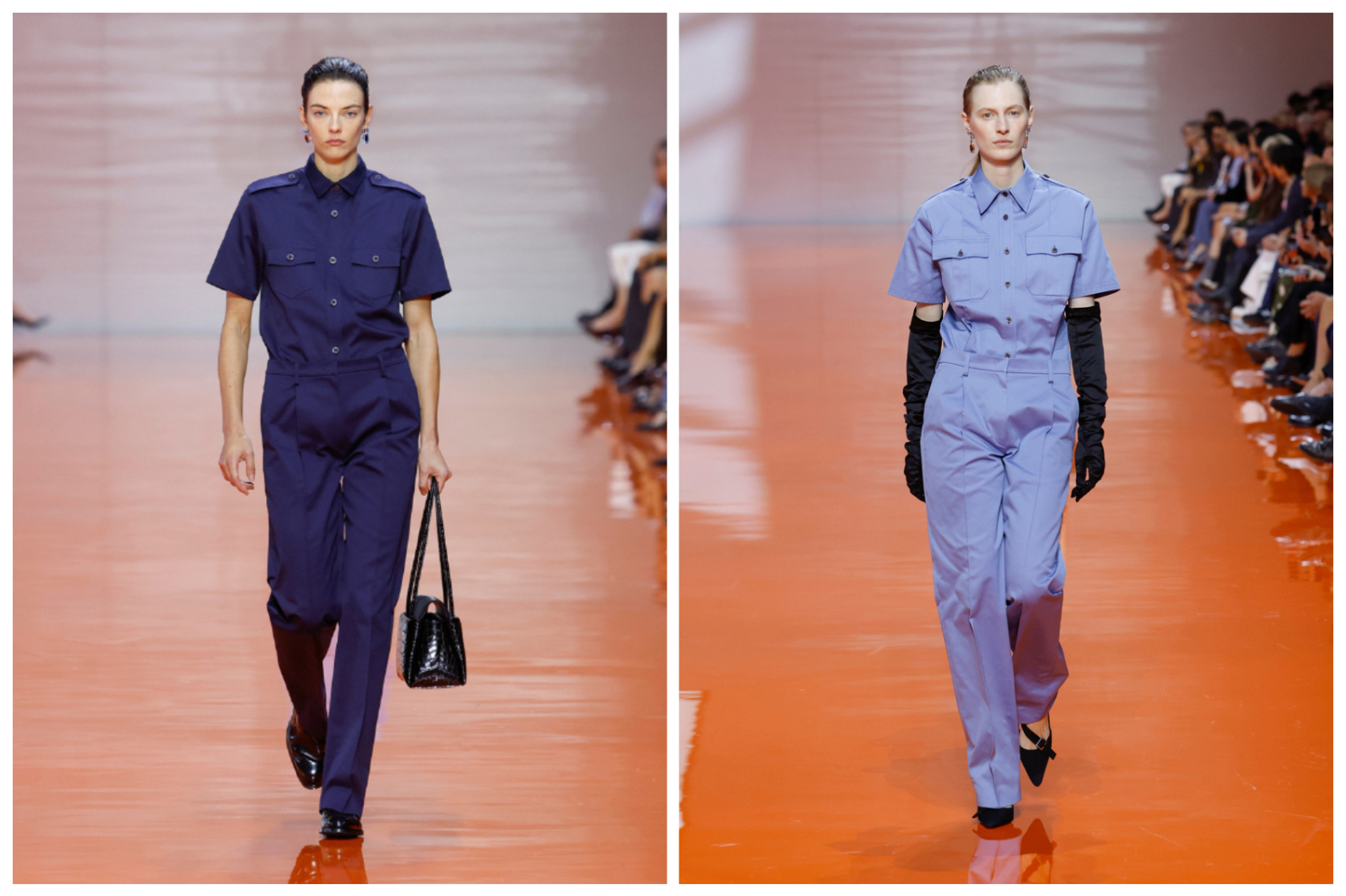 开场呈现数套连身工作服,搭配高跟鞋、华丽的歌剧手套与耳环。工作服与晚礼服元素的结合,既实现了不同风格元素的破格重组,也传递出消除服装等级划分的设计理念。