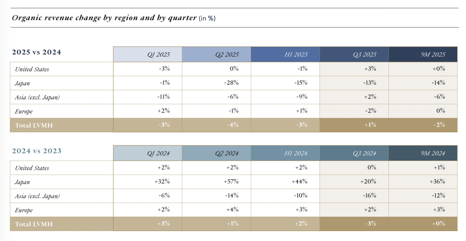 就第三季度而言,管理层在电话会议上表示,几乎所有主要地区的趋势均出现改善。美国和亚洲(不含日本)在第三季度重新实现正增长,中国市场在也第三季度实现了正增长。日本也显著改善,尽管基数仍然较高,但挑战较上半年有所缓和。欧洲总体保持稳定,由于游客消费下降、以及汇率波动影响较年初更为显著,营收受到一定压力。