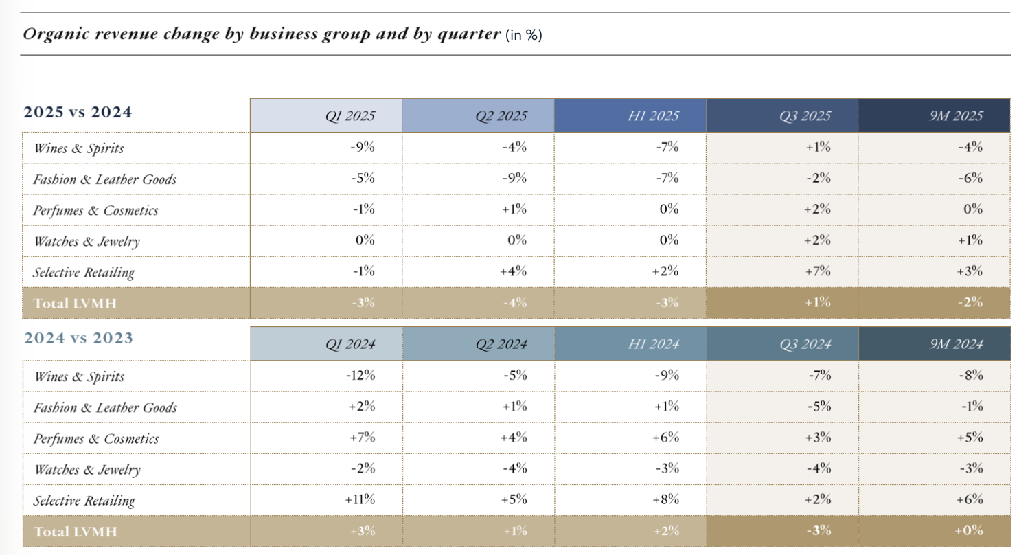 10月14日巴黎股市收盘后,法国奢侈品巨头 LVMH(路威酩轩)公布了截至9月30日的2025财年前九个月业绩报告:总营收同比下降4%至580.9亿欧元(在有机基础上:-2%),其中第三季度总营收在有机基础上同比增长1%,各业务部门及各地区均出现回升,唯独欧洲例外(欧洲前三季度营收同比持平,第三季度则下降2%)。