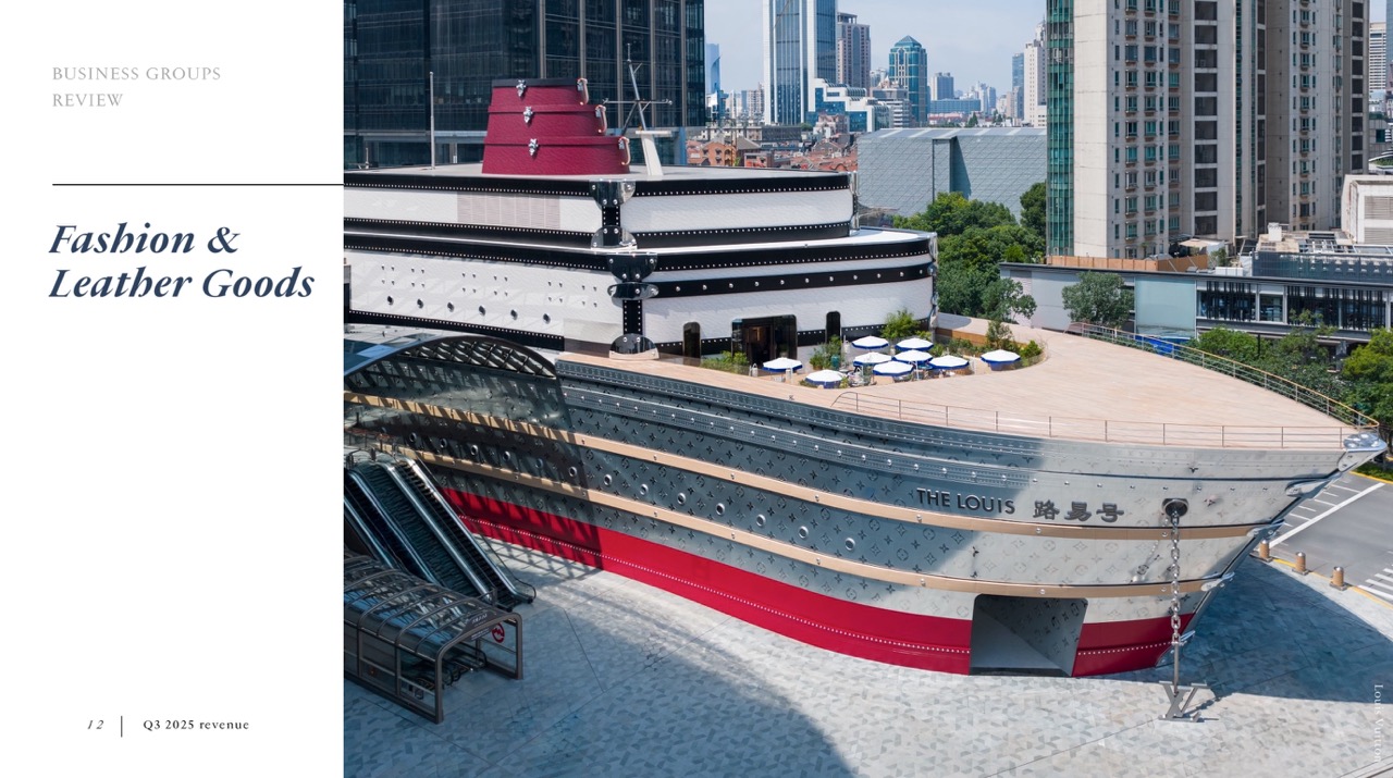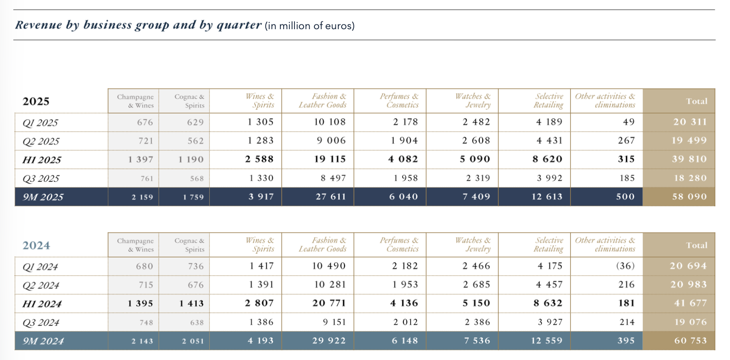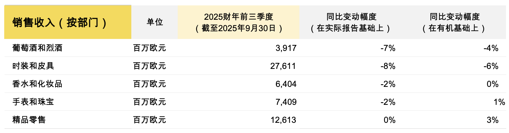 LVMH集团2025前九个月营收各季度变动(按部门及地区划分):