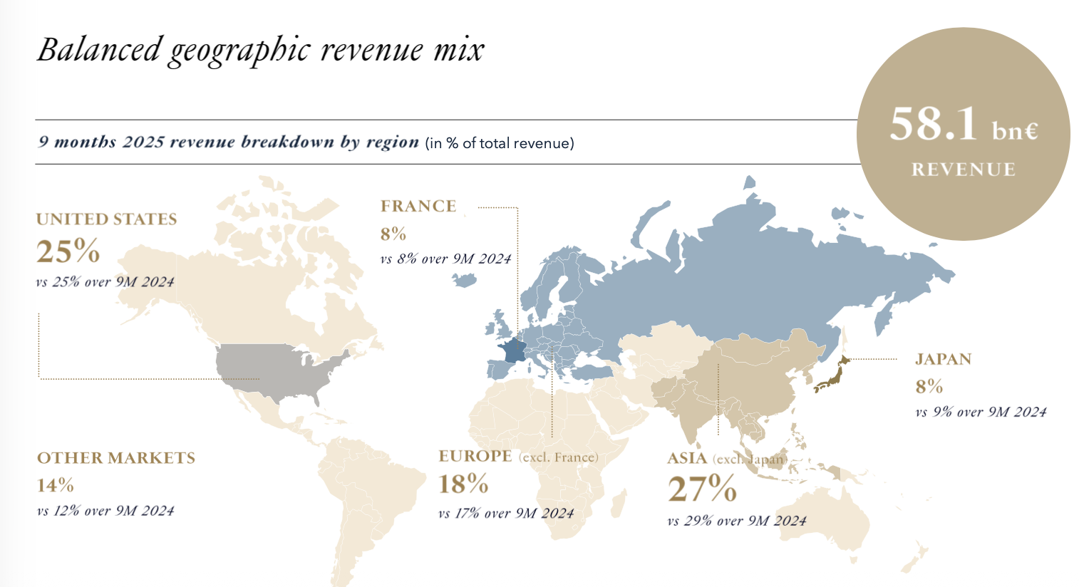今年前9个月,LVMH集团在各地区的销售结构保持均衡:尽管地缘政治与经济环境持续动荡,集团依旧展现出强劲的韧性与创新动力。欧洲与美国市场保持稳定,与2024年前九个月相比持平,本地消费需求稳健。日本市场较2024年同期下滑,主要因为去年受到日元大幅贬值带动的游客消费增长效应逐渐消退。亚洲( 不含日本)则较2024年呈现显著改善的趋势。