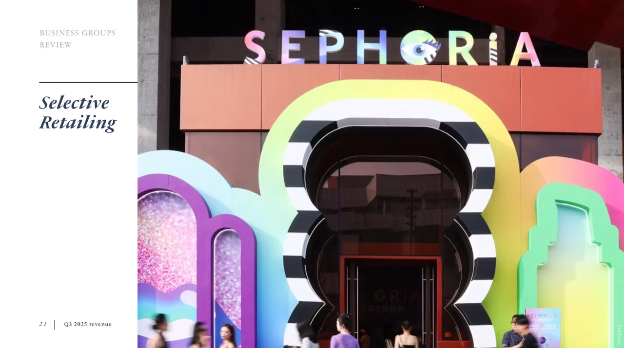 Sephora(丝芙兰)表现尤为突出,再度实现稳健的收入增长,并在多个国家继续扩大市场份额,巩固其全球领导地位。其独家经销的美妆品牌阵容持续丰富,Rhode的推出更创下销售纪录。