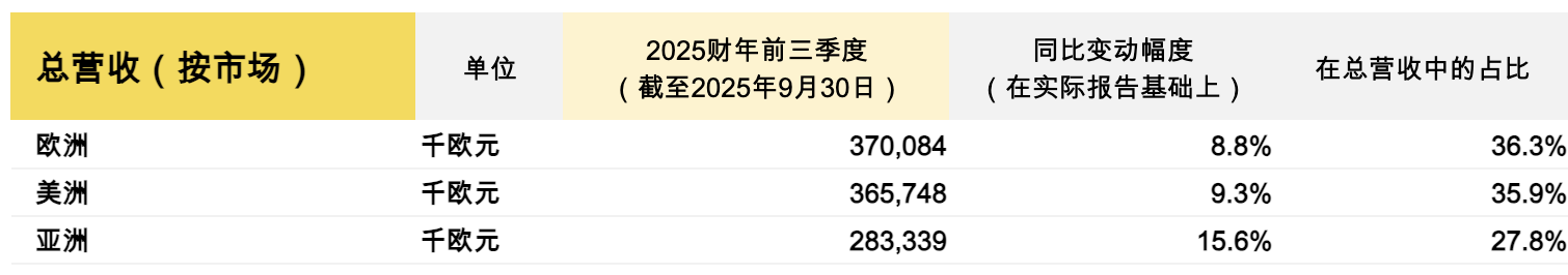 营收增长在所有地区均有体现,无论是在今年前九个月,还是在第三季度。第三季度总营收同比增长14.4%至2.10 亿欧元。