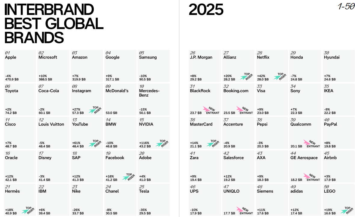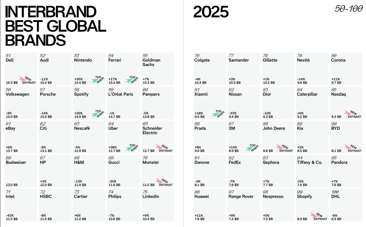 近日,国际品牌战略咨询公司 Interbrand 发布2025年全球最佳品牌排行榜(Best Global Brands 2025)。
