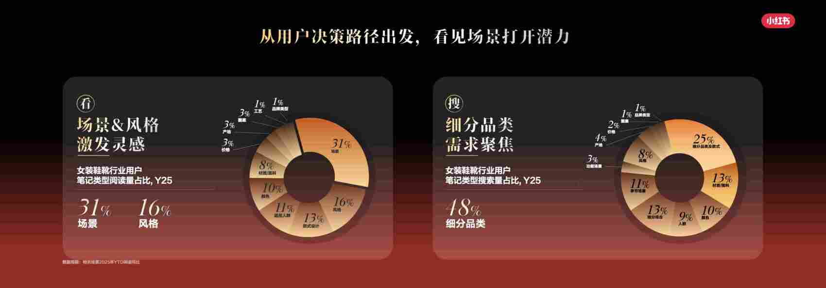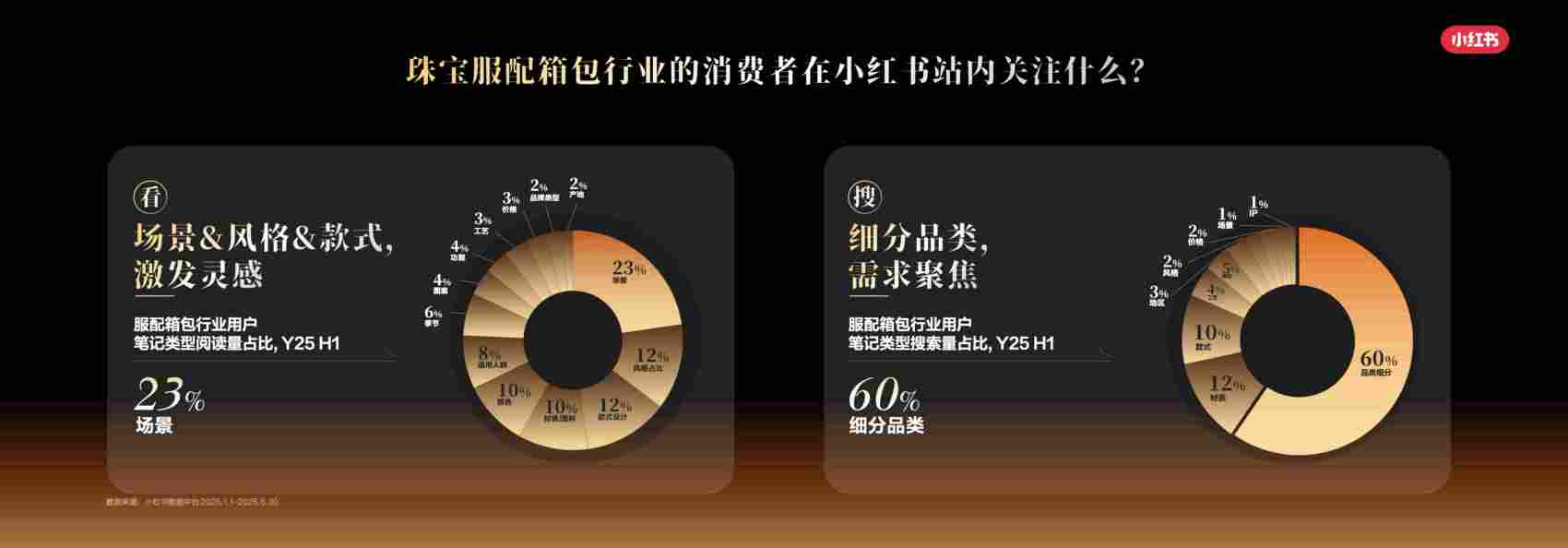 峰会披露的数据印证了这一全行业的用户心智共性:无论是女装(场景阅读占比31%)还是珠宝(场景阅读占比23%),用户在浏览内容、激发灵感时,普遍受“场景”和“风格”驱动;而当他们产生明确购买意图时,则更聚焦于“细分品类”(女装细分需求搜索占48%,珠宝细分品类搜索占60%)。(女装数据周期:2025.01-2025.09;珠宝数据周期:2025.01-2025.06)