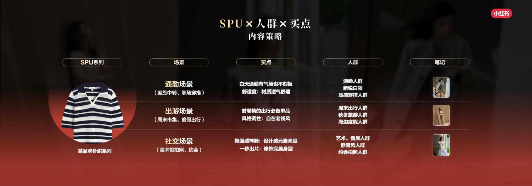 以某品牌针织系列为例,品牌在推广这一核心 SPU 时,并未将其简单定义为“一件毛衣”,而是基于小红书用户对“场景穿搭”的精细化需求,深度挖掘了其在多元场景下的细分买点。