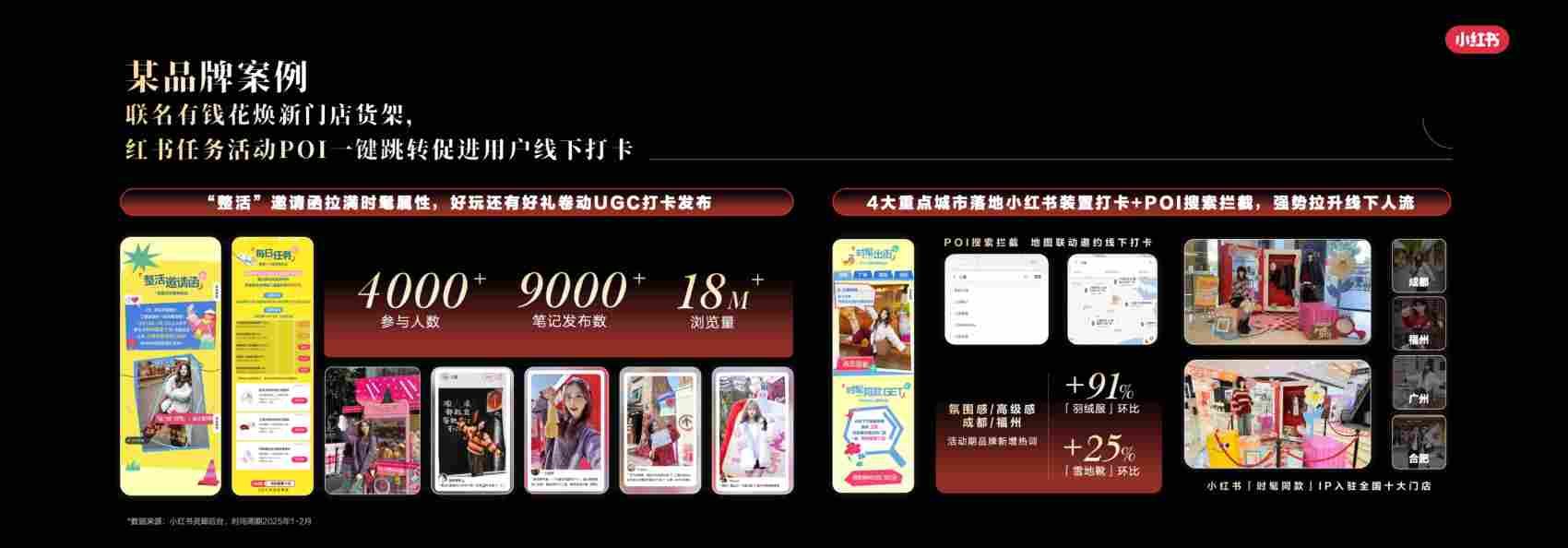 线下依然是服饰潮流行业的主战场。某品牌巧妙地将线上“时髦同款”IP活动与线下门店的POI(兴趣点)深度联动,通过线上任务吸引用户到店打卡,再通过线下物料引导用户回流线上分享。活动期间,相关笔记发布数超9000篇,浏览量达1800万+,成功将社区热度转化为真实的到店客流,实现了O2O的完美闭环。(数据周期:2025.01-2025.02)