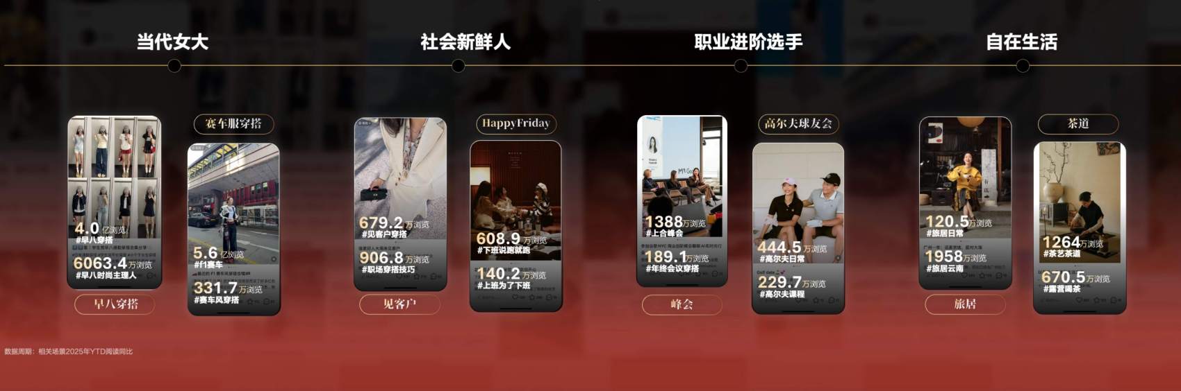 平台数据显示,“高层会”(同比+664%)、“对外谈判”(同比+285%)等职场进阶场景的阅读量同比高速增长。这种基于“人生发展路径”的洞察,帮助品牌跳出单纯的年龄划分,真正理解用户在不同生命阶段的核心关切与着装诉求。(数据周期:2025.01-2025.09)