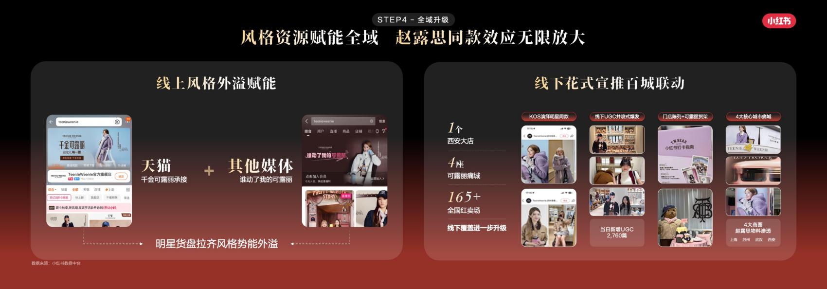 某女装品牌则通过在小红书的广泛种草,成功引爆了“千金可露丽”这一风格趋势。品牌在小红书通过“明星演绎+KOL种草+UGC发酵”的模式,将“千金可露丽”与品牌强绑定,这一强大的时尚势能迅速外溢至天猫、抖音等其他电商平台。我们看到,其他平台纷纷承接“千金可露丽”的风格热度,为品牌的线上全渠道生意提供了强大的新增量。