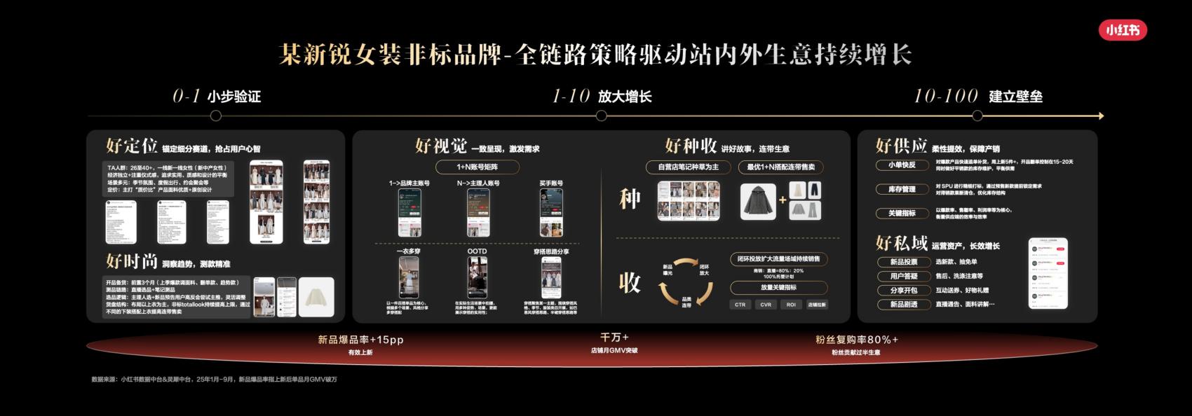 品牌通过“笔记测品”的方式,在新品正式推出前就进行小预算测试;更关键的是,其选品逻辑包含一个“灵活调整”的闭环:即通过“新品预告”来测试用户反响,一旦某款产品获得高热度反馈,品牌就会迅速将其升级为主推款。这意味着用户的早期反馈(如评论、互动)会直接影响品牌的主推策略,这正是一种高效的“与用户共创”。在这个过程中,用户的每一次互动都成为产品优化的直接依据。通过这套“洞察趋势+测款精准”的打法,该品牌成功实现了店铺月GMV 突破千万,新品爆品率提升15个百分点的亮眼成绩。(数据周期:2025.01-2025.09)