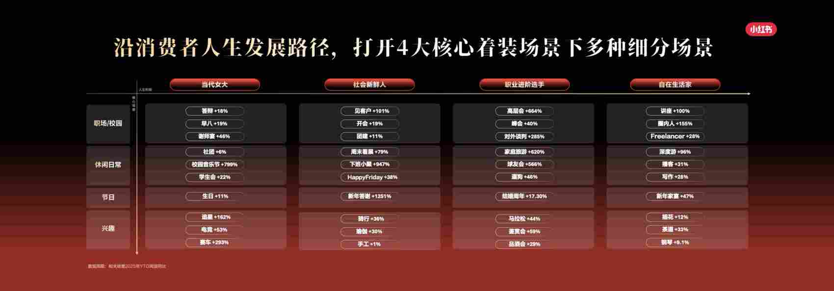 一个极具代表性的发现是女装赛道独特的“人生阶段”场景。据小红书会上分享:“就算是同样的主场景,一个人处在不同的人生阶段时,细分场景偏好是完全不一样的。”
