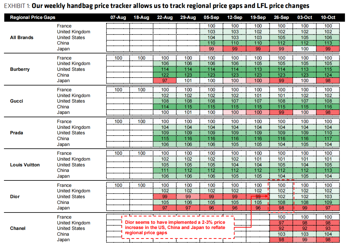 DataBoutique 2025 年第三季度的数据显示,Dior 在日本的售价比法国低 5%。Bernstein 的每周手袋数据显示,同一款 Dior 手袋在日本的售价比法国低 4%(经外汇调整后,截至 9月底)。事实上,一旦计入外汇因素,Dior 在所有主要地区的售价都相当接近。