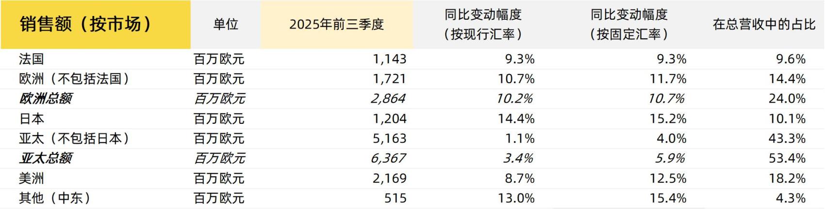 前三季度营收119亿欧元,按固定汇率计算同比增长8.6%(按当前汇率计算增长6.3%)。此外,财报披露,汇率波动对集团营收造成了2.54亿欧元的负面影响。