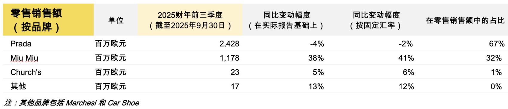 - Prada 品牌:品牌展现出良好的韧性,前九个月零售销售额同比下降1.6%,第三季度同比下降0.8%。