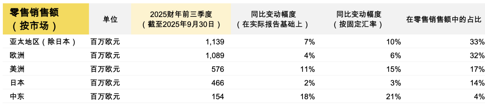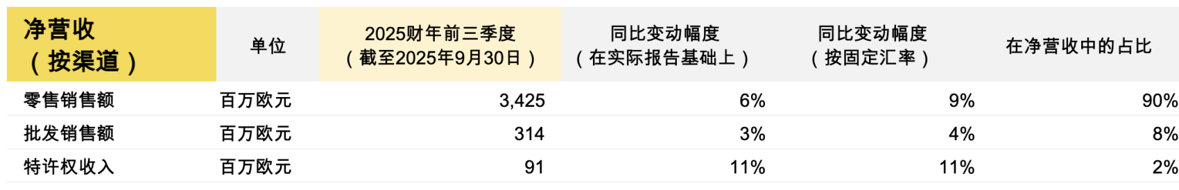- 零售渠道:在前9个月实现9%的增长,主要受同店销售增长与正价销售推动,不过新门店贡献有限;第三季度营收同比增长8%,与第二季度持平,在去年同期高基数(+18%)的情况下仍展现出稳健表现。