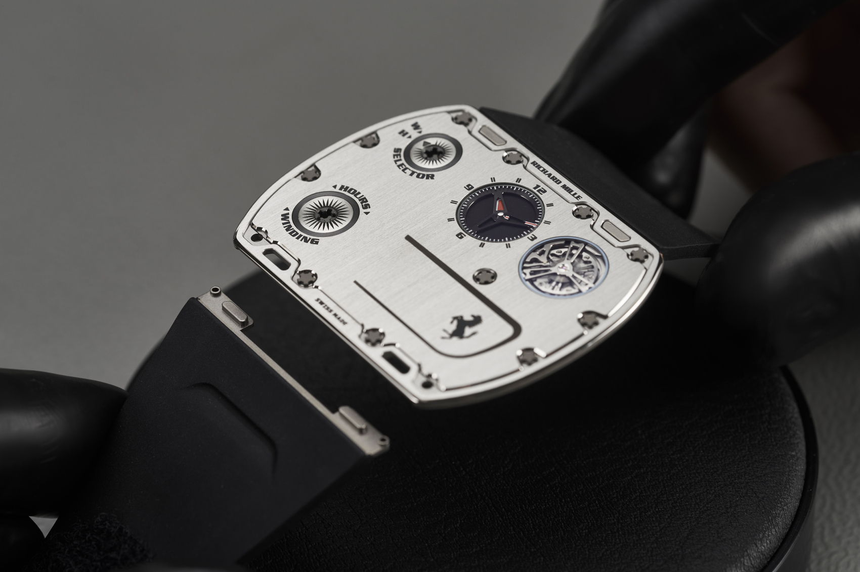 RM UP-01 FERRARI完全颠覆了传统腕表的擒纵结构,采用获得专利的超薄发条盒配备极细游丝,重新思考上链机制,并取消了上链柄轴。