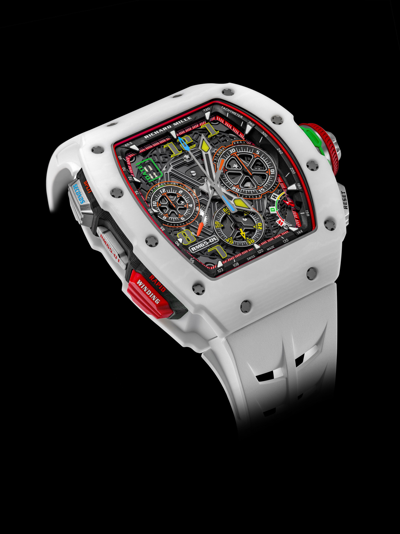 它搭载品牌最复杂之一的RMAC4自动计时码时机芯,实现高达1/10秒的精准计时。机芯的底板与桥板采用常用于航空航天及汽车制造领域的五级钛合金,达到极低的重量与抗冲击力比例优势。