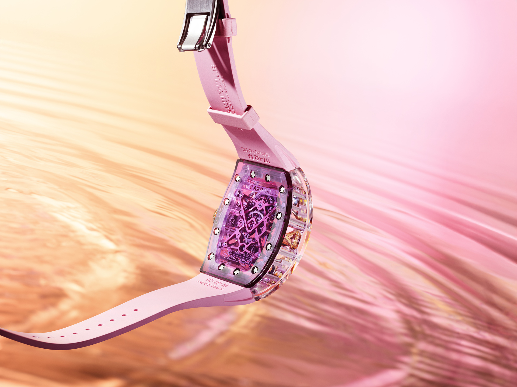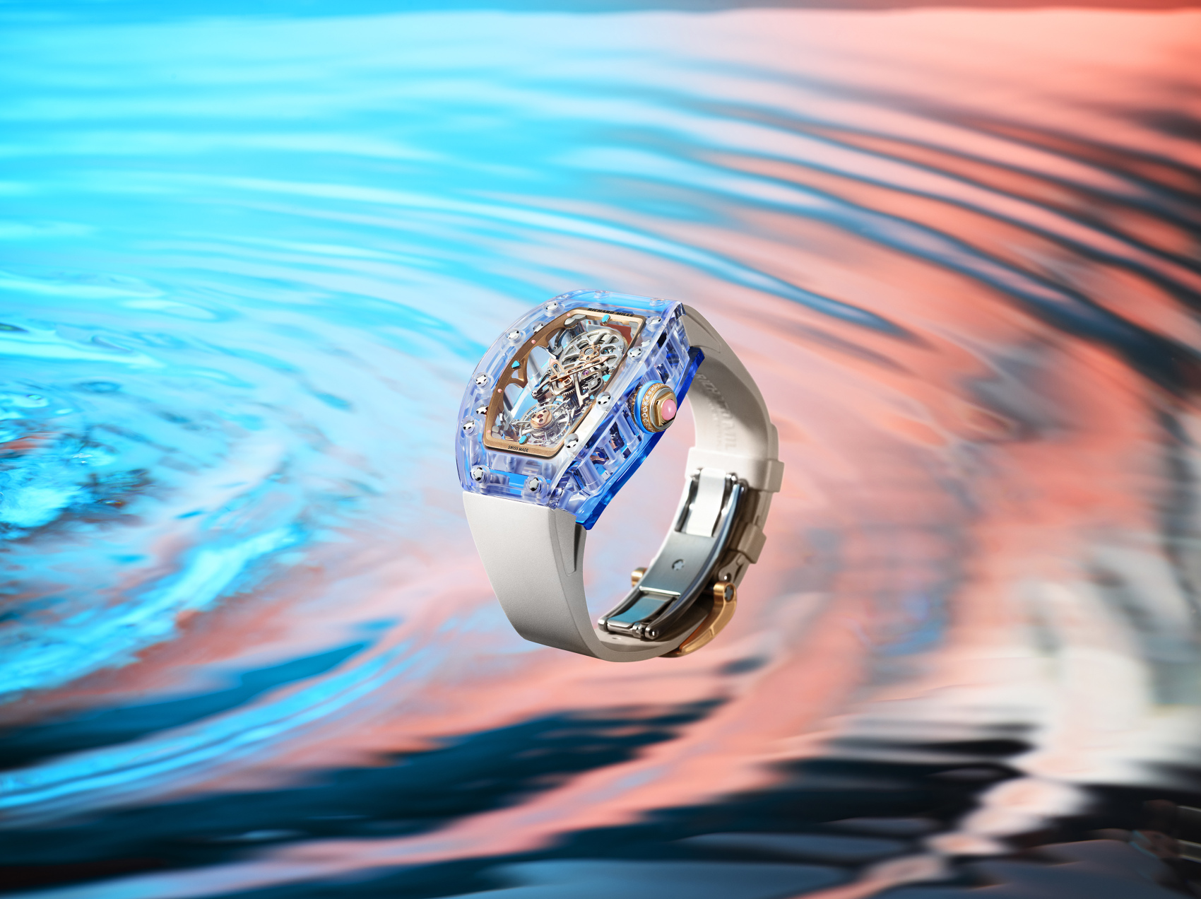 RM 75-01还推出了彩色蓝宝石水晶版本。彩色蓝宝石的工艺远比透明蓝宝石更为严苛,其原理在于晶体结构中融入金属氧化物,添加量须格外精准,它影响了彩色蓝宝石水晶的成色。