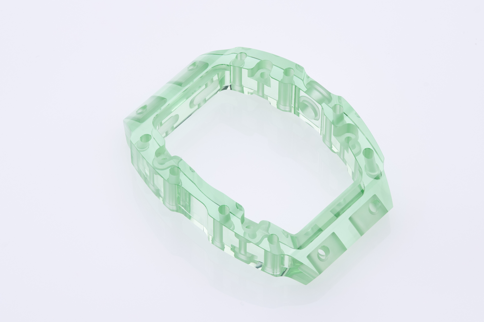 品牌从数十公斤的原石中切削出三件式表壳,工时逾千小时,其中打磨工序持续40天不间断。以全件切削工艺制作的腕表无需任何外部结构支撑便能组装部件,通体的透明质感让机械机芯复杂精美的构造一览无遗。
