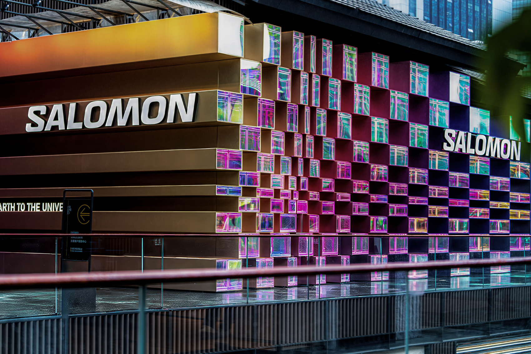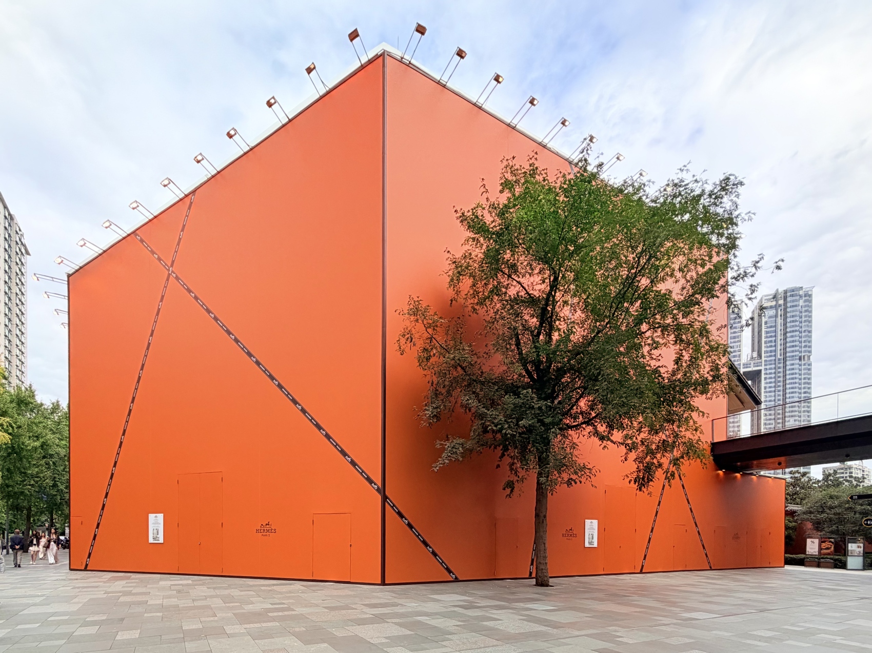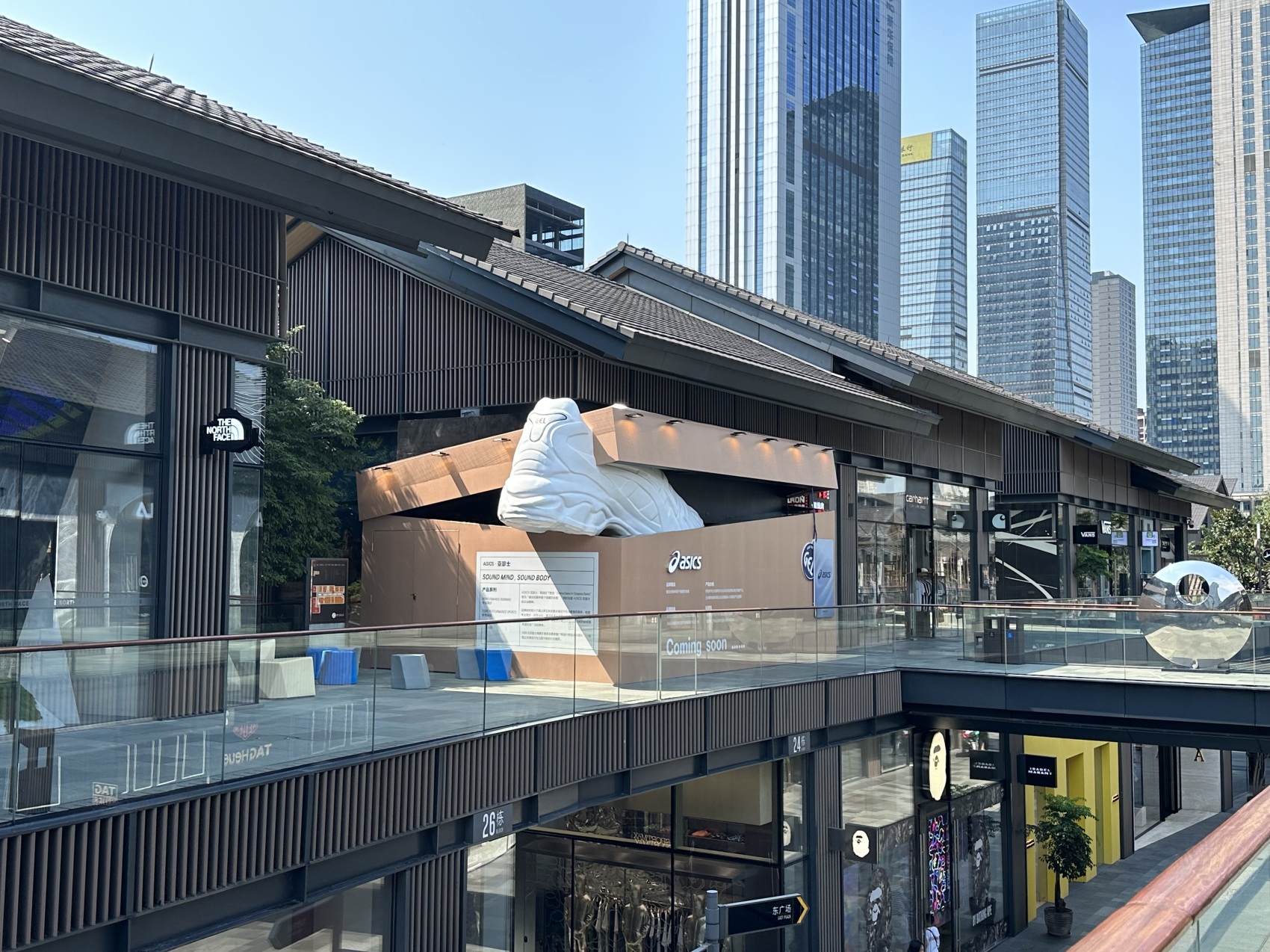不仅是店铺空间,许多品牌在其入驻前的围挡阶段也会花心思去创作,让“成都太古里店”始终特别受到消费者的关注和期待,也能看出品牌方对于投资成都太古里特别重视。比如正全面升级中的 HERMES 爱马仕最近以其标志橙色呈现超大独栋围挡,让大家对其升级后的样子充满好奇和期待,SALOMON 萨洛蒙则通过镭射灯光的立体外立面呈现出宇宙未来感,以及此前 ASICS 亚瑟士曾以鞋盒为概念呈现潮流艺术围挡等。